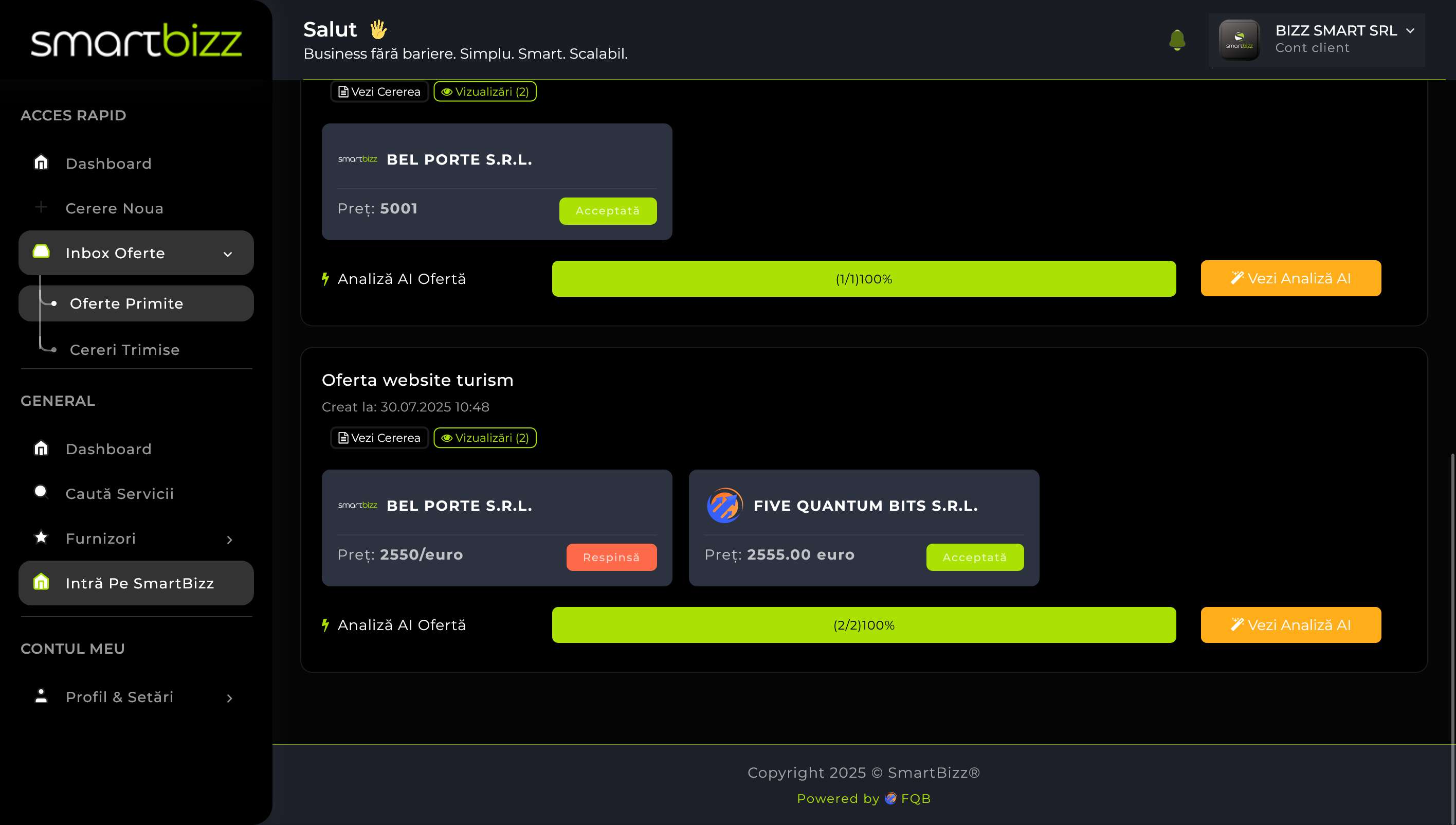 Proiectul SmartBizz.ro subliniază expertiza noastră în dezvoltarea de soluții web complexe pentru mediul de afaceri. La Five Quantum Bits, transformăm viziuni de business în platforme digitale performante, care livrează rezultate măsurabile și susțin creșterea pe termen lung a partenerilor noștri.