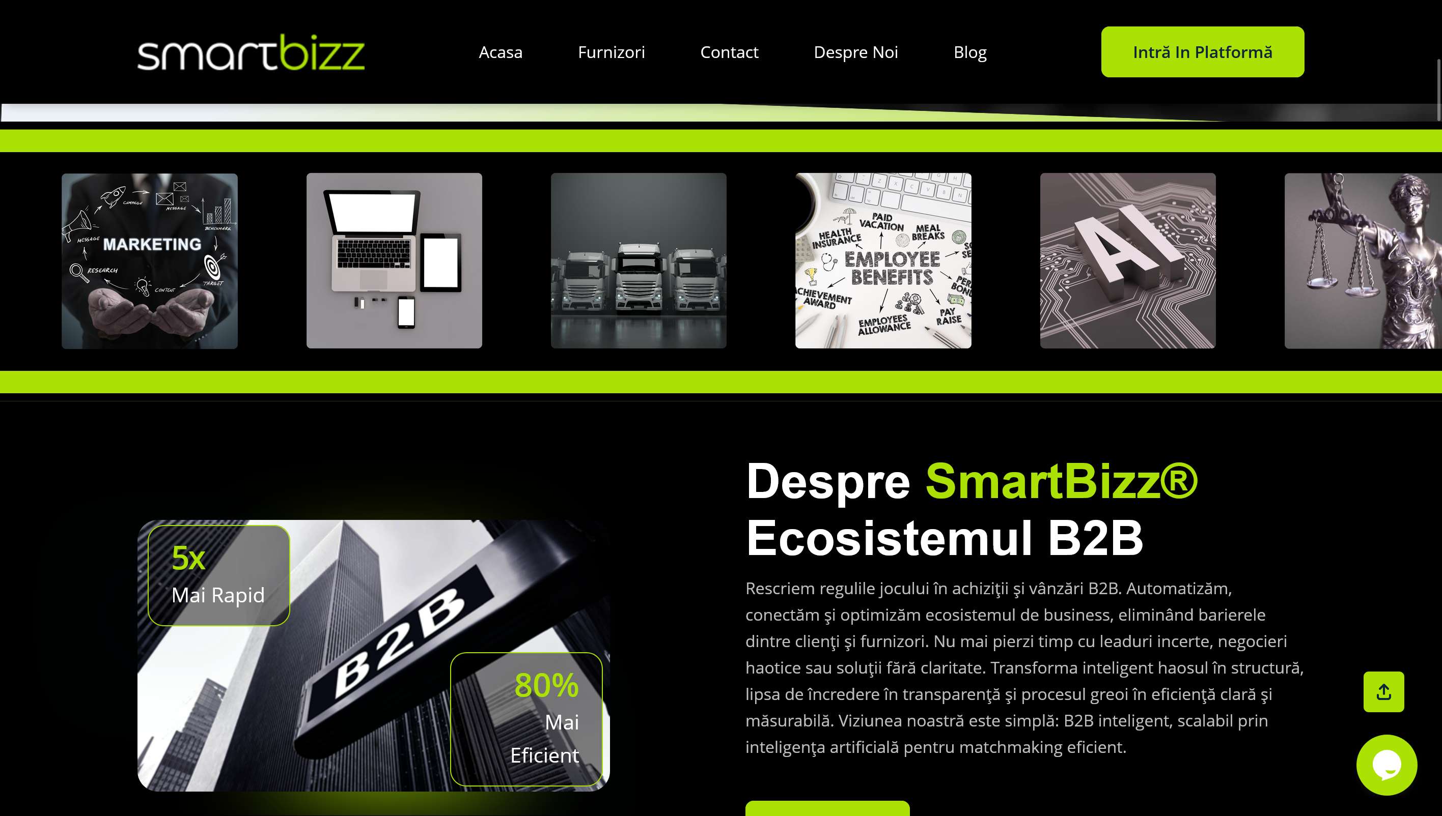 Scopul proiectului a fost crearea unei platforme B2B flexibile, cu un design modern și o funcționalitate impecabilă. Am construit un panou de administrare propriu, utilizând o arhitectură solidă bazată pe PHP, JavaScript și jQuery. Acesta oferă echipei SmartBizz autonomie deplină în gestionarea serviciilor, a studiilor de caz și a conținutului de specialitate. Interfața, realizată cu Bootstrap, garantează o experiență de navigare premium pe orice dispozitiv.
